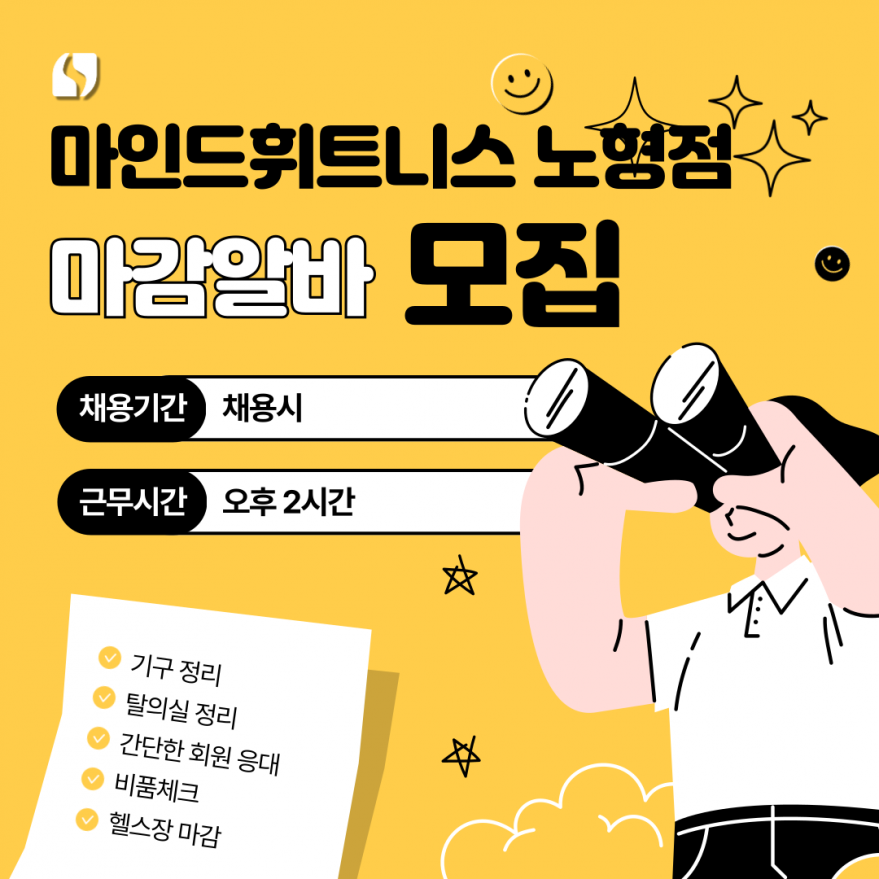 업무내용 : 헬스장 마감 및 정리, 시설 점검, 마무리 청소, 간단한 회원 응대
