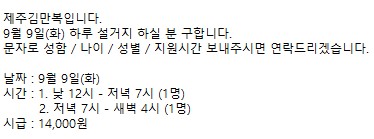 하루_설거지_알바_구합니다. 페이지 정보 작성자 제OOO복 작성일25-09-08 08:52 조회444회 연락처 010-5685-0355 급여 시급 : 14000 관련링크 본문 제주김만복 주소 : 제주특별자치도 제주시 오라로 41 제주김만복 본점 이전글 다음글 목록
