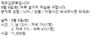 9월9일_하루_근무자_구인합니다 페이지 정보 작성자 제OOO복 작성일25-09-07 12:37 조회644회 연락처 010-5685-0355 급여 시급 : 11000 관련링크 본문 제주김만복 주소 : 제주특별자치도 제주시 오라로 41 제주김만복 본점 이전글 다음글 목록