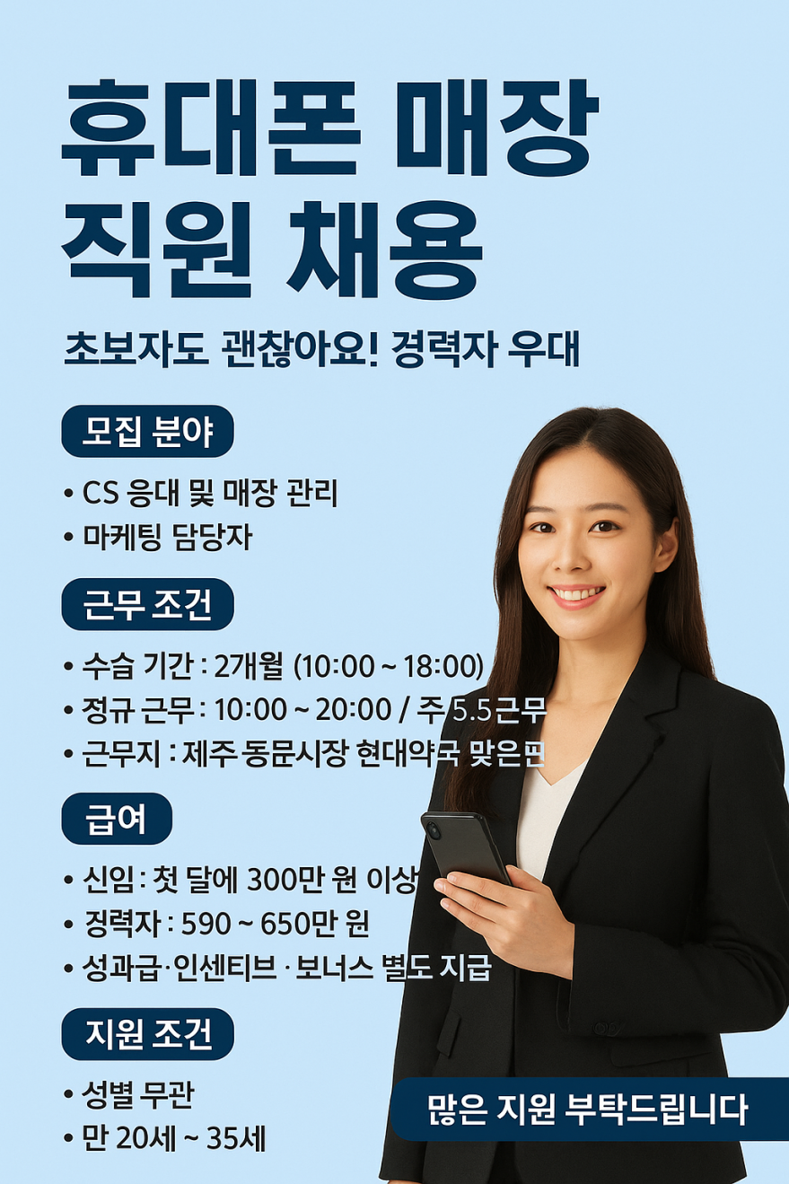 3) 기본 CS업무 매장 관리라 판매만 하는 업무 아니고 제주도 내 동문 시장 현대 약국 맞은편 제일 오래된 매장으로 유동 인구 및 방문 고객