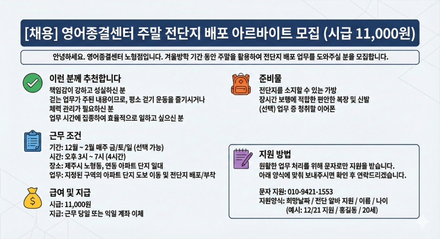 [주말 꿀알바] 영어학원 전단지 배포 알바 모집(친구랑 같이 지원!) 페이지 정보 작성자 lOOOOOe 작성일25-12-23 14:08 조회417회 연락처 010-9421-1553 급여 시급 : 11000 관련링크 본문 주소 : 제주특별자치도 제주시 월랑로 59 세흔빌딩 6층 이전글 다음글 목록