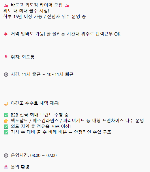 배달대행 바로고 외도점에서 기사님구합니다 페이지 정보 작성자 외OOO고 작성일25-10-19 14:50 조회1,083회 연락처 010-2290-1870 급여 일당 : 150000 관련링크 본문 주소 : 제주특별자치도 제주시 우정로4길 29 이전글 다음글 목록