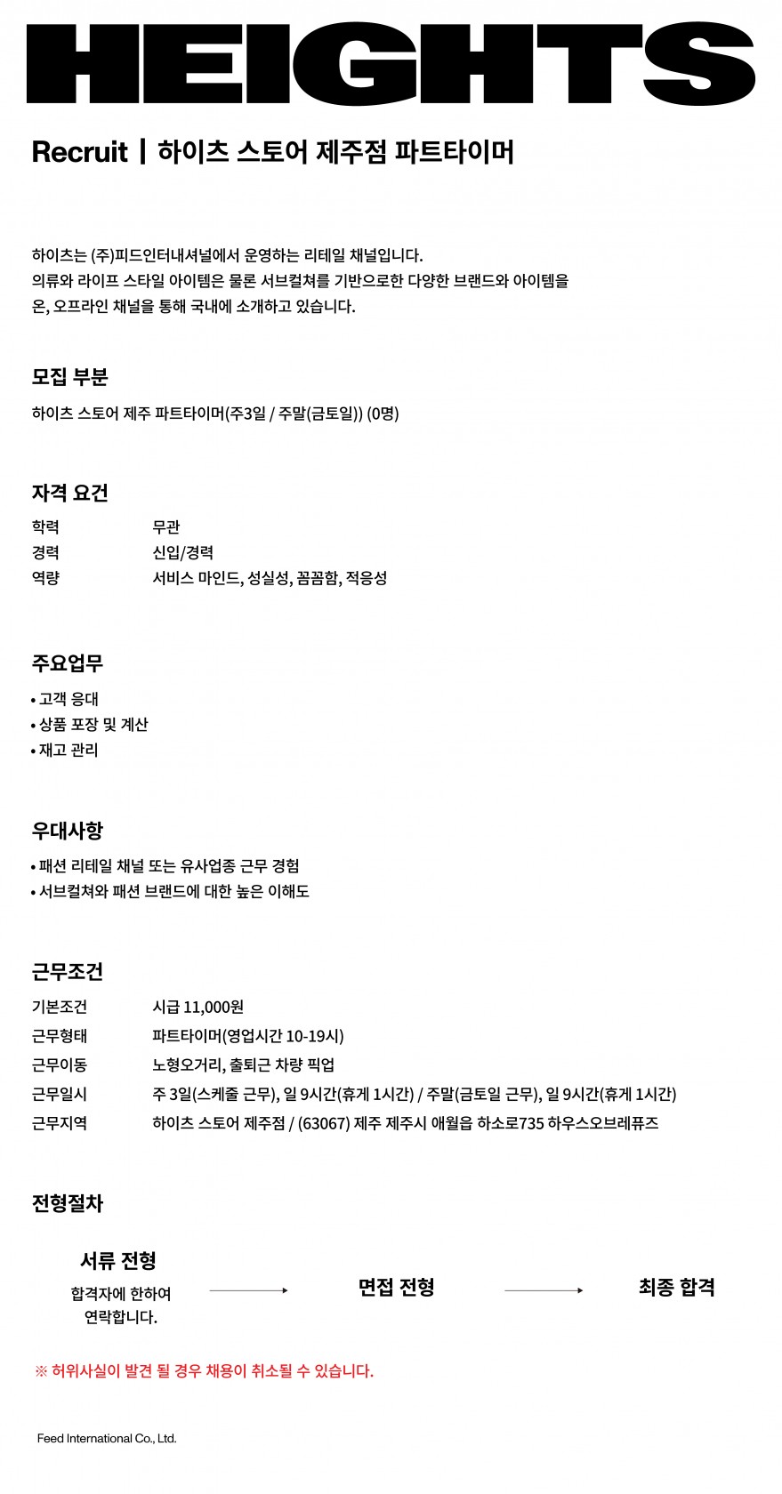 HEIGHTS 하이츠 제주 파트타이머 페이지 정보 작성자 jOOOOOu 작성일25-11-25 18:21 조회1,281회 연락처 010-9032-9337 급여 시급 : 11000 관련링크 본문 접수 기간 및 방법• 접수 기간: 채용 시 마감• 제출 서류: 이력서 및 경력 기술서 첨부 필수• 접수 방법: recruit@feedintl.com 주소 : 제주특별자치도 제주시 애월읍 하소로 735 이전글 다음글 목록
