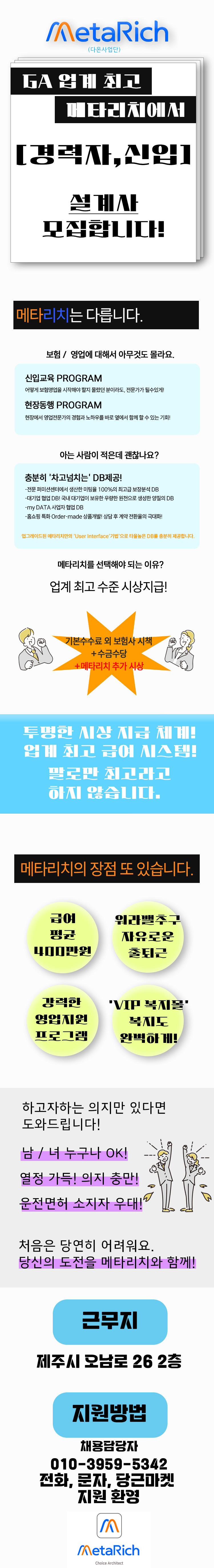내가 정하는 워라밸! 나이무관! 경력무관! 직무설명회만 들어도 됩니다. 페이지 정보 작성자 메OO온 작성일25-05-08 15:27 조회2,795회 연락처 010-3959-5342 급여 월급 : 400만원 관련링크 본문 진심으로 누구나 가능합니다.나이 무관! 성별 무관!워라밸은 본인이 정하는!직무설명회만 들으러 오셔도 됩니다. 주소 : 제주특별자치도 제주시 관덕로15길 9 3층 이전글 다음글 목록