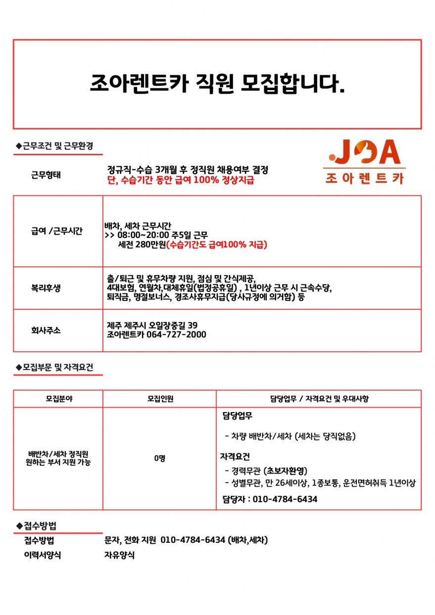 조아렌트카 배차세차 정직원 모집합니다. 출퇴근/휴무 차량 지원 페이지 정보 작성자 jOOOOa 작성일25-05-01 08:58 조회2,292회 연락처 010-4784-6434 급여 월급 : 280만원 관련링크 본문 주소 : 제주특별자치도 제주시 오일장중길 39 조아렌트카 이전글 다음글 목록