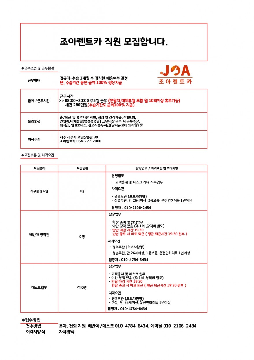 ⭐໒(◉ᴥ◉)७조아렌트카 / 예약실데스크배차 / 출퇴근휴무차량지원 페이지 정보 작성자 쎄OO어 작성일25-12-17 17:18 조회313회 연락처 010-4784-6434 급여 월급 : 280만원 관련링크 본문 주소 : 제주특별자치도 제주시 오일장중길 39 조아렌트카 이전글 다음글 목록
