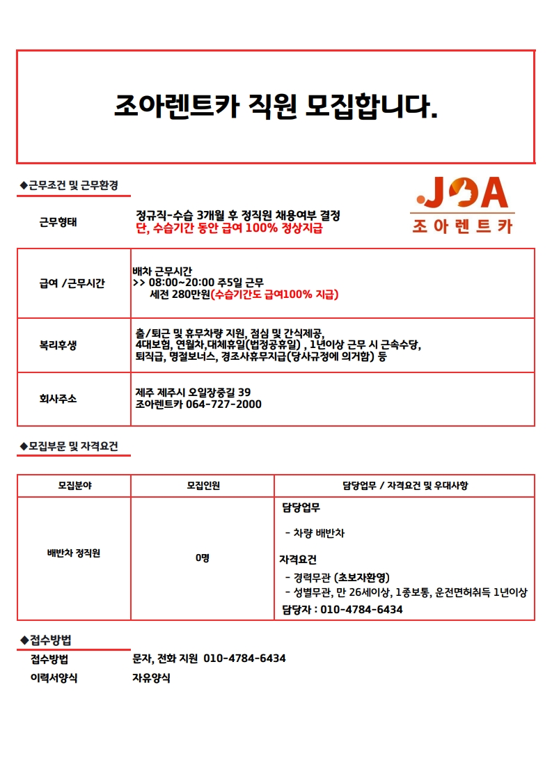 조아렌트카 배차세차 정직원모집합니다. 출퇴근/휴무차량지원★ 페이지 정보 작성자 jOOOOa 작성일25-04-23 09:29 조회1,803회 연락처 010-7610-4018 급여 월급 : 280만원 관련링크 본문 . 주소 : 제주특별자치도 제주시 오일장중길 39 조아렌트카 이전글 다음글 목록
