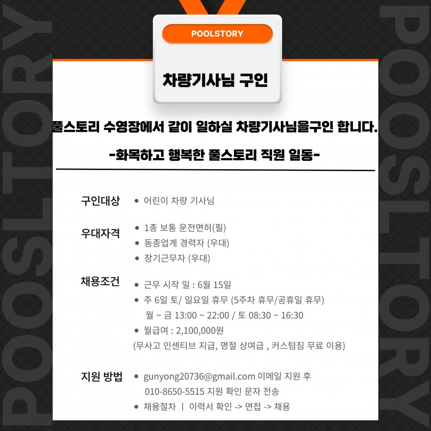 풀스토리 수영장에서 같이 일하실 차량기사님을 구인합니다. 페이지 정보 작성자 pOOOOOOOy 작성일24-06-03 14:05 조회9,732회 연락처 010-8650-5515 급여 월급 : 210만원 관련링크 본문 풀스토리 수영장에서 같이 일하실 차량기사님을 구인합니다! 이력서 제출후 문자 한번 부탁드립니다 주소 : 제주특별자치도 제주시 연사6길 57 지하 1층 풀스토리 수영장 이전글 다음글 목록