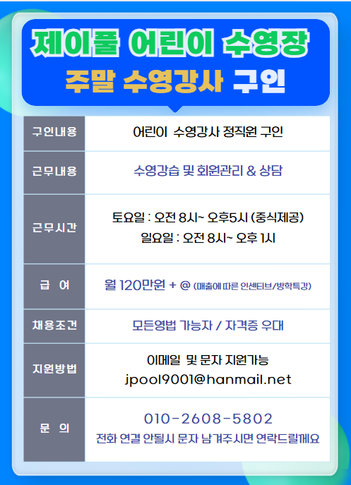어린이 수영장 제이풀 주말강사 채용공고 페이지 정보 작성자 스O프 작성일24-05-29 18:21 조회4,895회 연락처 010-2608-5802 급여 월급 : 120만원 관련링크 본문 어린이 수영장 제이풀입니다.아이들과 즐겁게 주말에 강습해주실 강사님 채용합니다 주소 : 제주특별자치도 제주시 연화남길 22 이전글 다음글 목록