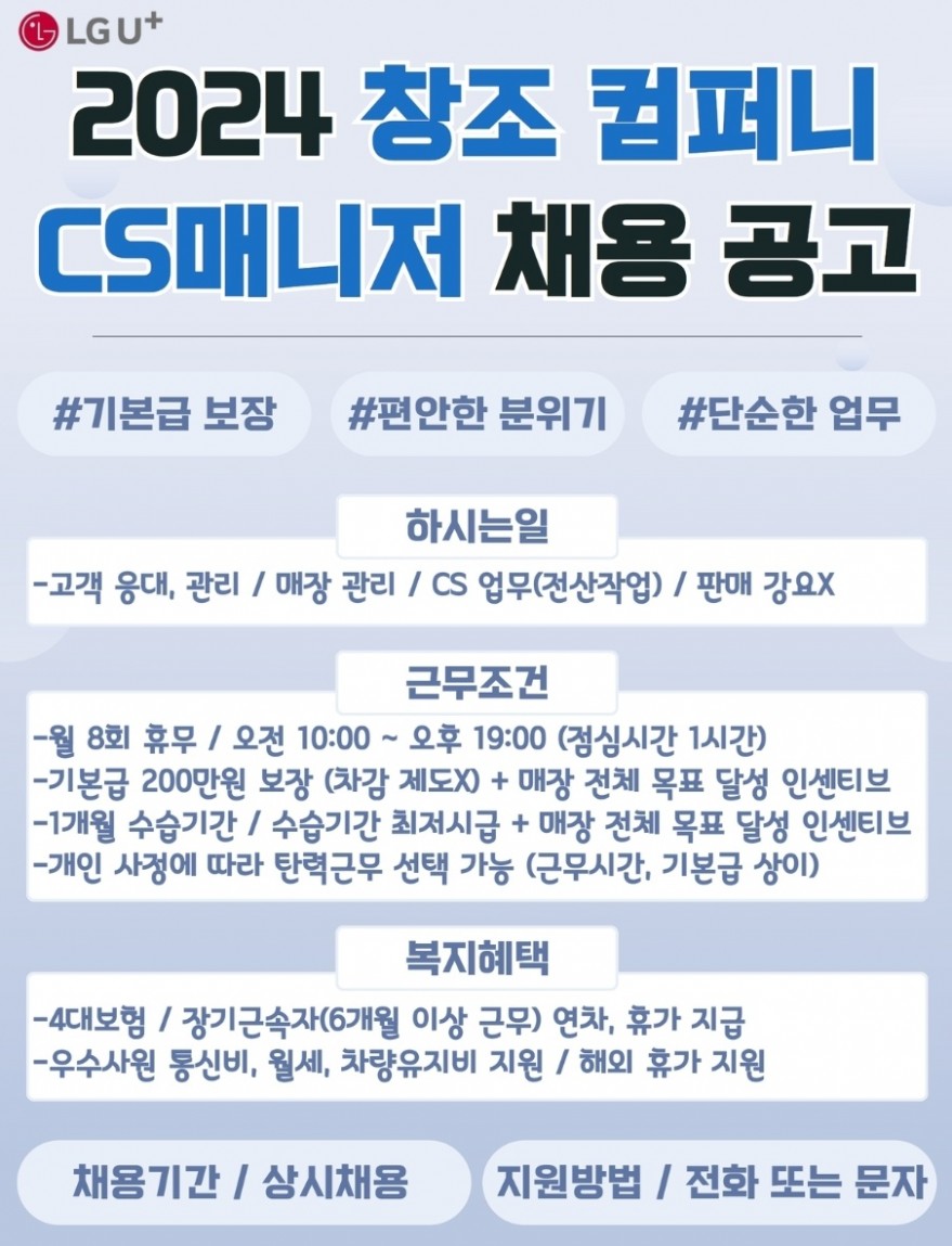 창조에서 인원 채용합니다 페이지 정보 작성자 유OO스 작성일24-05-22 13:09 조회6,734회 연락처 010-8080-5136 급여 월급 : 250+@ 관련링크 본문 ■기본급 차감 절대 없습니다 ■최소 실적 달성시 월 300이상 ■매장 목표 달성시 추가 인센티브 ●●장기근속자는 통신비 ,차량지원 ,자취하는 직원 월세지원 ●● 주소 : 제주특별자치도 제주시 연북로 34 1층 엘지 이전글 다음글 목록