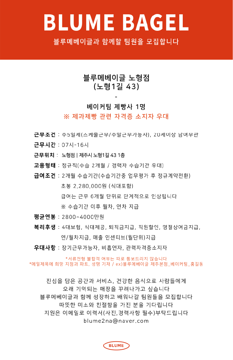 블루메베이글 노형점에서 함께할 제빵사를 구인합니다:) (관련자격증필수) 페이지 정보 작성자 블OOOO글 작성일25-02-11 11:05 조회1,429회 연락처 010-4419-4343 급여 협의 : 0 관련링크 본문 이력서는 이메일로 부탁드립니다. blume2na@naver.com 주소 : 제주특별자치도 제주시 노형1길 43 1층 이전글 다음글 목록
