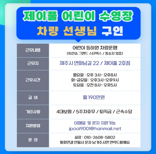 <제이풀> 차량운행 선생님 구인 페이지 정보 작성자 스O프 작성일24-05-19 10:35 조회4,725회 연락처 010-2608-5802 급여 월급 : 190만원 관련링크 본문 어린이 수영장 < 제이풀> 입니다.아이들 등하원시 안전하게 운행해주실 선생님 구인합니다. (차량 동승자 따로 있음) 주소 : 제주특별자치도 제주시 연화남길 22 이전글 다음글 목록