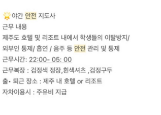 5월 21-23 화수목 3박 야간 안전지도사구함 페이지 정보 작성자 또잉 작성일24-05-16 10:13 조회5,437회 연락처 010-2691-5099 급여 일당 : 90000 관련링크 본문 여자분으로 구하고있습니다~ 전화는 잘못받으니 문자남겨주세요 주소 : 제주특별자치도 제주시 연무정길 28 현대아파트 ㅇㄹㅇㄻㄴ 이전글 다음글 목록