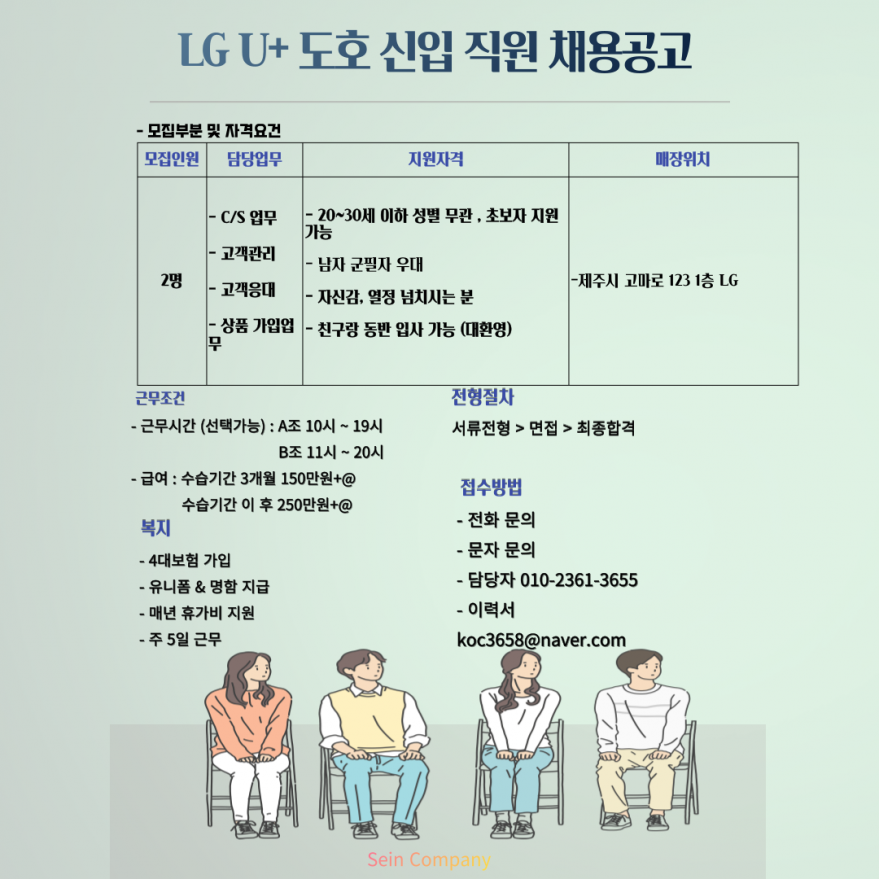 LG U+ 세인 직원채용 페이지 정보 작성자 으OO핫 작성일25-04-04 18:17 조회2,498회 연락처 010-2361-3655 급여 월급 : 3000000 관련링크 본문 LG유플러스 세인에서 직원 모집합니다. 주소 : 제주특별자치도 제주시 고마로 123 LG유플러스 이전글 다음글 목록