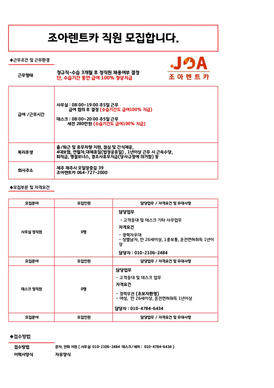 조아렌트카) 데스크,사무실 직원을 모집합니다. / 출퇴근 및 휴무차량 지원 페이지 정보 작성자 jOOOOa 작성일24-05-08 09:04 조회11,466회 연락처 010-4784-6434 급여 월급 : 280만원 관련링크 본문 . 주소 : 제주특별자치도 제주시 오일장중길 39 조아렌트카 이전글 다음글 목록