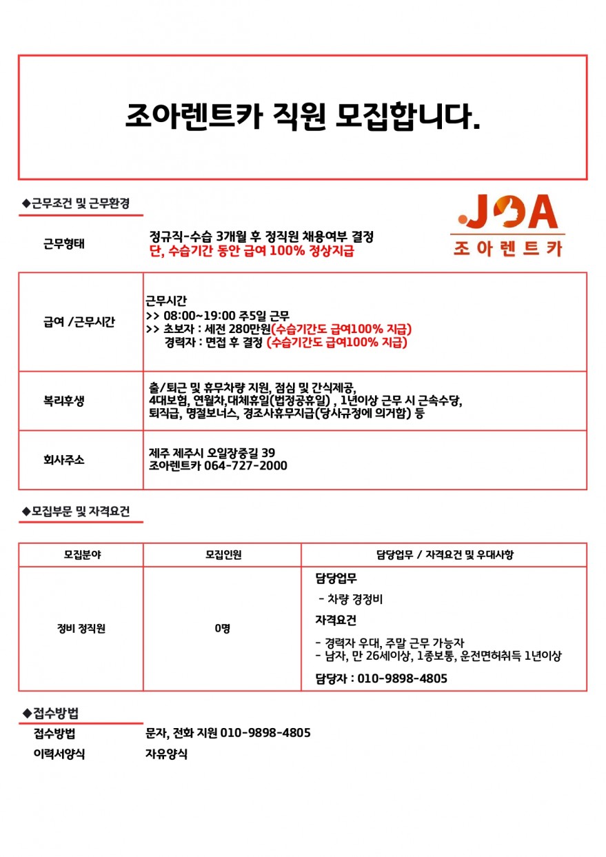 조아렌트카 정비 정직원 모집합니다. 출퇴근/휴무 차량 지원 페이지 정보 작성자 jOOOOa 작성일25-01-31 11:08 조회1,531회 연락처 010-9898-4805 급여 월급 : 280만원 관련링크 본문 주소 : 제주특별자치도 제주시 오일장중길 39 조아렌트카 이전글 다음글 목록
