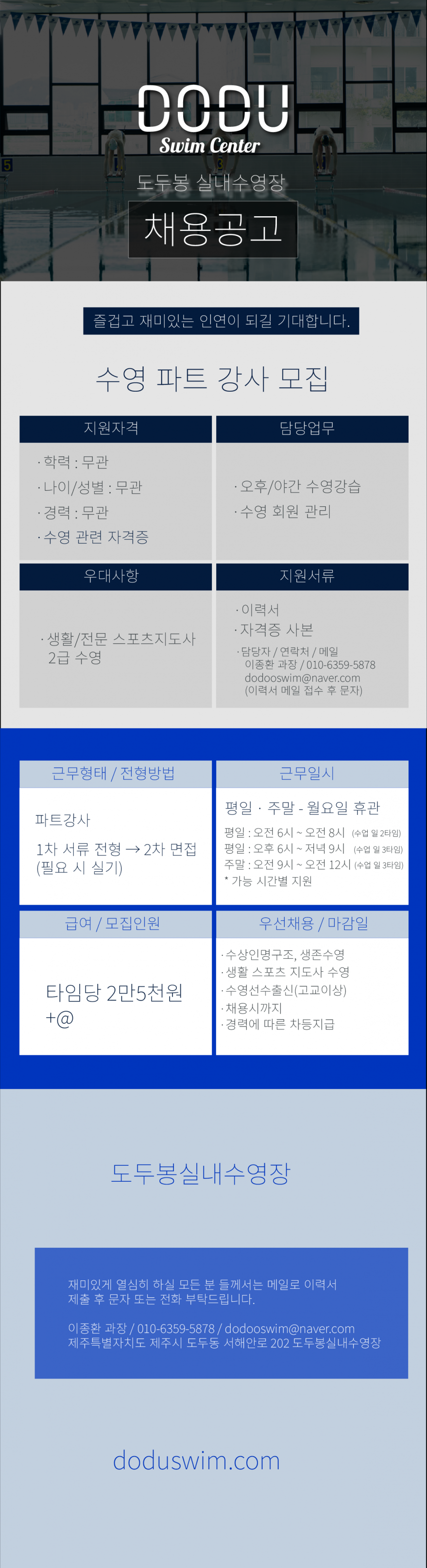 도두봉실내수영장 파트강사 모집 페이지 정보 작성자 도OOOOOO장 작성일25-03-28 07:40 조회2,106회 연락처 010-6359-5878 급여 시급 : 30000 관련링크 본문 ▶전형방법 : 1차 서류전형 → 2차 면접담당자 : 이종환과장연락처 : 010 6359 5878마감일 : 채용 완료 시 까지 - 이력서 메일 접수 / 이력서 자유양식 사용 가능 https://doduswim.com 주소 : 제주특별자치도 제주시 서해안로 202 이전글 다음글 목록