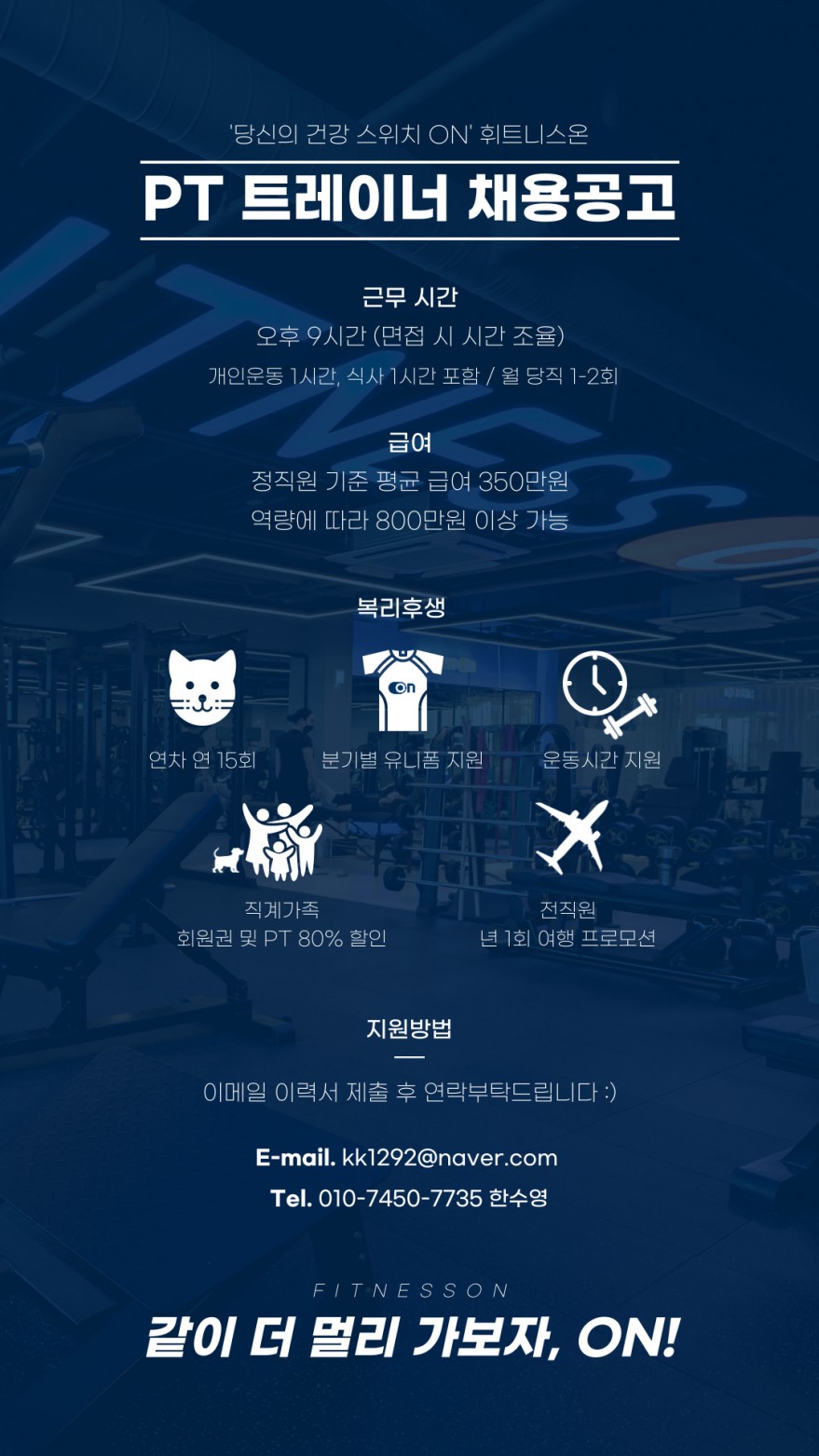 구남동에 위치한 휘트니스온에서 PT 여자 선생님(경력직)을 구인하고 있습니다 페이지 정보 작성자 한O영 작성일25-03-04 16:51 조회1,980회 연락처 010-7450-7735 급여 협의 : 00 관련링크 본문 구남동에 위치한 휘트니스온에서 PT 여자 선생님을 구인하고 있습니다 ▶근무시간 : 협의 가능 ▶연락처 : 010.7450.7735 ▶메일 주소 : hsy_7450@naver.com 많은 지원 부탁드립니다 주소 : 제주특별자치도 제주시 중앙로 360 이전글 다음글 목록