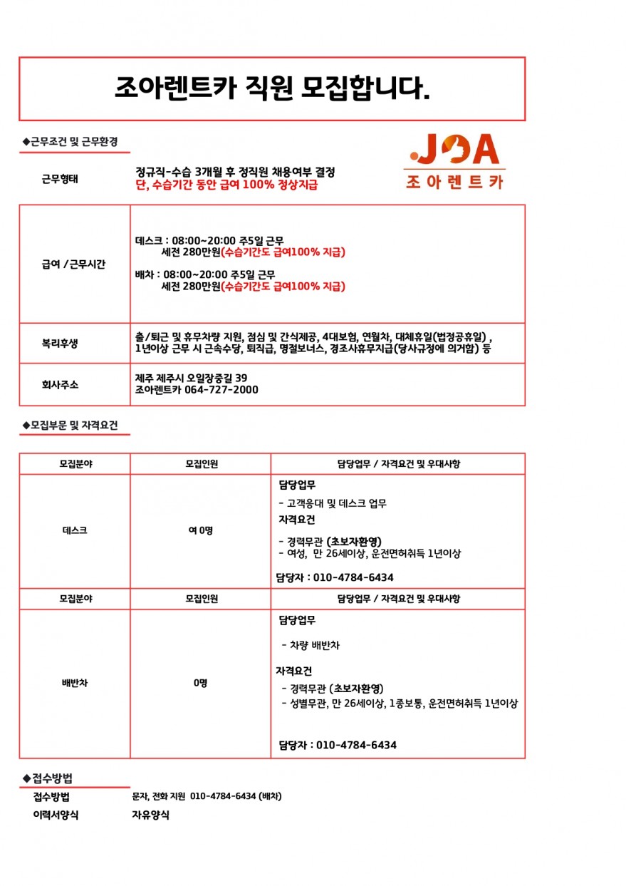 조아렌트카 정직원 모집합니다. 출퇴근/휴무 차량 지원 페이지 정보 작성자 쎄OO어 작성일25-02-28 17:18 조회1,550회 연락처 010-4784-6434 급여 월급 : 280만원 관련링크 본문 주소 : 제주특별자치도 제주시 오일장중길 39 조아렌트카 이전글 다음글 목록