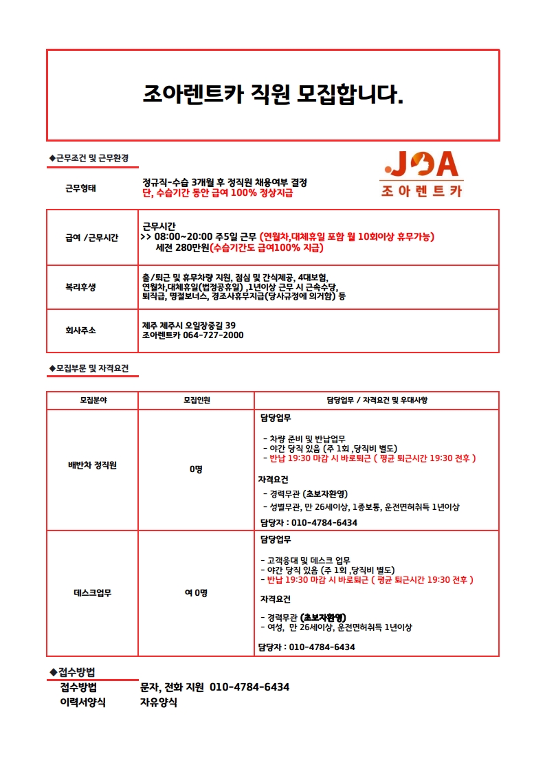 ໒(◉ᴥ◉)७ ㈜조아렌트카 데스크/배차 정직원 모집!! 출퇴근/휴무 차량 지원 페이지 정보 작성자 jOOOOOt 작성일25-08-22 12:08 조회562회 연락처 010-4784-6434 급여 월급 : 280만원 관련링크 본문 주소 : 제주특별자치도 제주시 오일장중길 39 조아렌트카 이전글 다음글 목록
