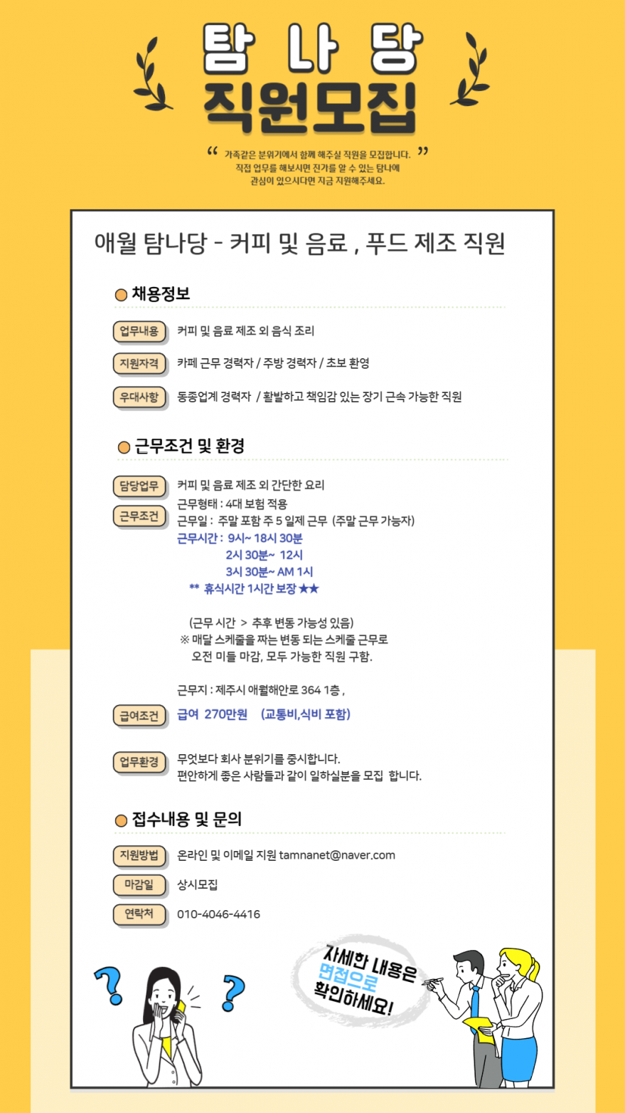 주 5일제 애월 카페 직원 모집/ 급여 270만원 페이지 정보 작성자 탐O당 작성일25-08-20 09:19 조회562회 연락처 010-4046-4416 급여 월급 : 270만원 관련링크 본문 // 주소 : 제주특별자치도 제주시 애월읍 애월해안로 364 1층 탐나넷 이전글 다음글 목록