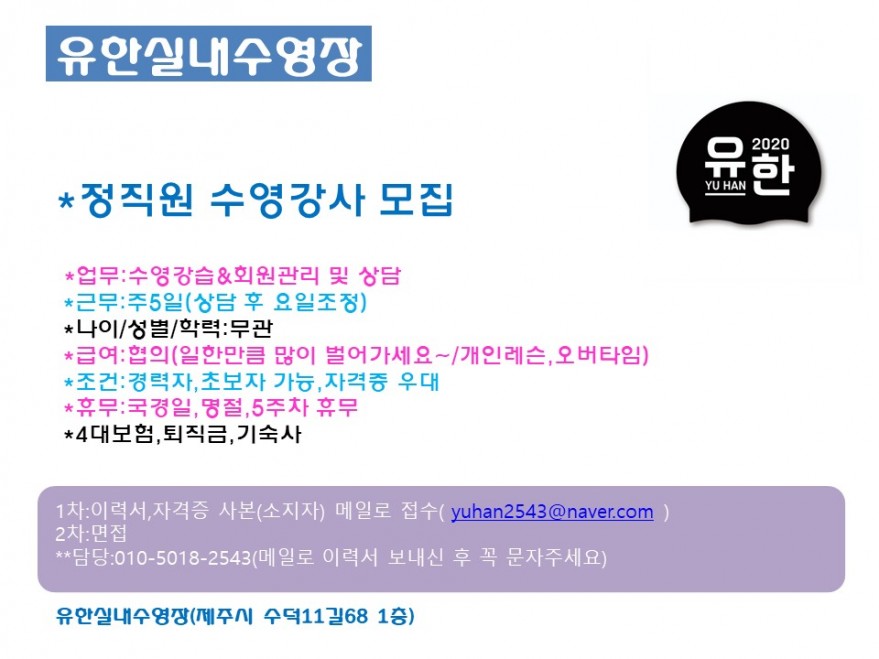 유한실내수영장 남녀 정직원 수영강사 모집(제주시 노형동) 페이지 정보 작성자 코O로 작성일25-01-09 20:21 조회3,163회 연락처 010-5018-2543 급여 협의 : 0 관련링크 본문 제주시 노형동에 위치한 유한실내수영장에서 남녀 정직원 수영강사님을 모집합니다.(3개월 된 막내 선생님도 지금 300~400은 벌어가고 계십니다./일하신 만큼 가져가시면 됩니다) 주소 : 제주특별자치도 제주시 수덕11길 68 1층 유한실내수영장수영장 이전글 다음글 목록