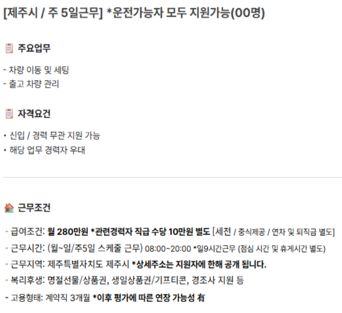 [제주시 / 주 5일근무] *운전가능자 모두 지원가능(00명) 페이지 정보 작성자 동토 작성일25-08-18 10:55 조회539회 연락처 010-3106-0895 급여 월급 : 2,800,000원 관련링크 본문 주소 : 제주특별자치도 제주시 용담이동 2002 제주국제공항 제주시 용문로**(상세주소는 지원자의 한해 공개됩니다) 이전글 다음글 목록