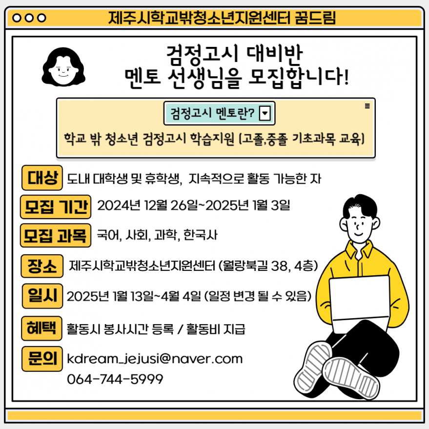 제주시학교밖청소년지원센터에서 검정고시대비반 멘토 선생님을 모집합니다! 페이지 정보 작성자 이O두 작성일24-12-26 09:45 조회3,018회 연락처 010-3047-5884 급여 시급 : 20000 관련링크 본문 *활동지원비는 멘토선생님 소정의 교통비로시간 당 20000원이 아니라는점 참고 부탁드립니다 !!제주시학교밖청소년지원센터에서 검정고시대비반 학습지원 멘토 선생님을 모집합니다 ! 주소 : 제주특별자치도 제주시 월랑북길 38 4층 제주시학교밖청소년지원센터 이전글 다음글 목록