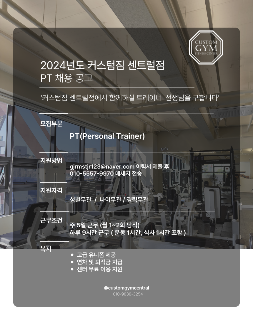 ◈◈◈커스텀짐 센트럴점에서 트레이너 선생님을 모집합니다◈◈◈ 페이지 정보 작성자 커OOOOOO점 작성일24-12-11 10:53 조회3,168회 연락처 010-5557-9970 급여 협의 : 협의 관련링크 본문 . 주소 : 제주특별자치도 제주시 1100로 3324 3,4층 커스텀짐 센트럴점 이전글 다음글 목록