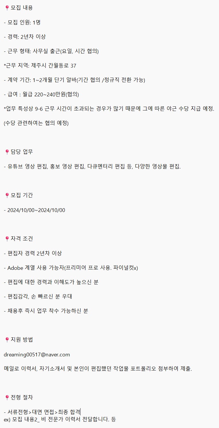 [급구]드림엔터테인먼트와 함께할 단기 및 장기 영상편집자를 모집합니다 페이지 정보 작성자 드O3 작성일24-10-27 14:58 조회3,661회 연락처 010-5679-7042 급여 월급 : 220~240만원(협의) 관련링크 본문 드림엔터테인먼트와 함께할 단기 및 장기 영상 편집자를 모집합니다. 최대한 빨리(11월즈음부터) 업무 착수 가능한 편집자분 찾고 있습니다! 많은 지원바랍니다 주소 : 제주특별자치도 제주시 간월동로 37 이전글 다음글 목록