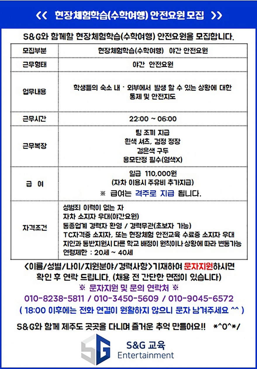 단기 수학여행안전요원 모집합니다!! 페이지 정보 작성자 lOOOOOO1 작성일24-10-26 16:38 조회3,846회 연락처 010-8238-5811 급여 일당 : 110000 관련링크 본문 다음주 수학여행안원요원 해주실분 모집합니다. 책임감 가지고 열심히 해주실분 지원 부탁드려요. 첨부사진에 내용 참고 해주시면 됩니다. 추후 문의사항은 연락주시면 답변 해드리겠습니다. 감사합니다. 주소 : 제주특별자치도 제주시 신산로1길 3 3층 이전글 다음글 목록