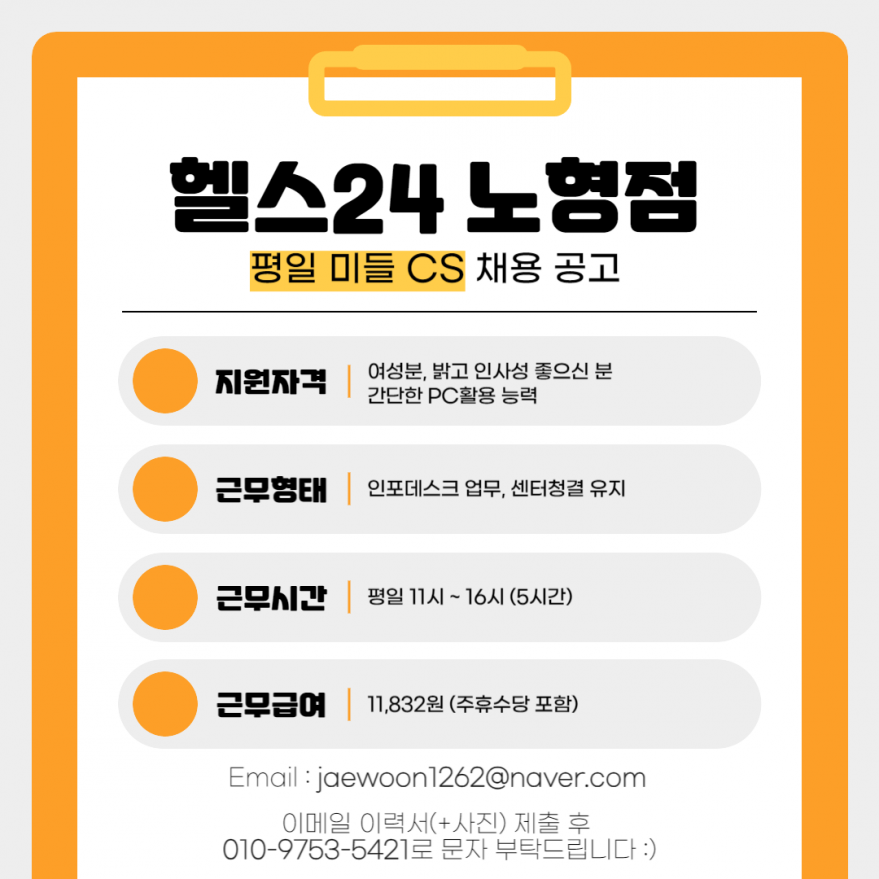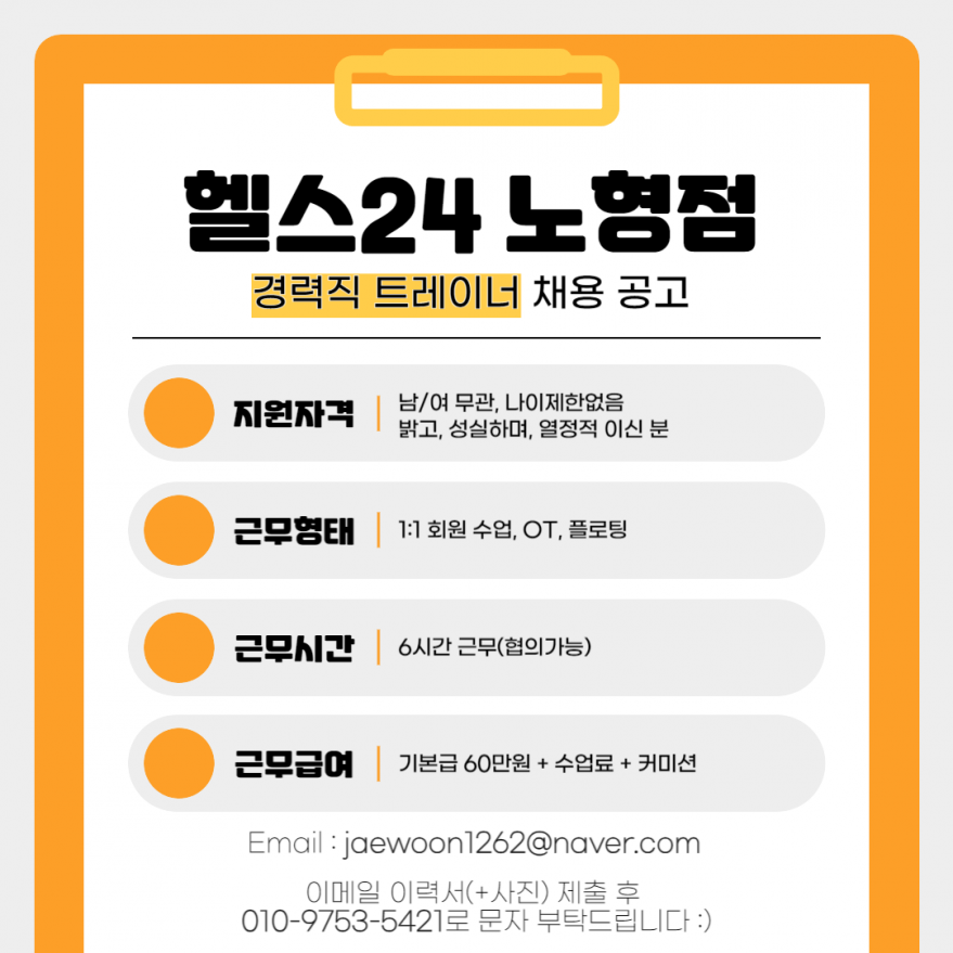 ♥♥♥재밌게 일 할 사람♥♥♥ 페이지 정보 작성자 헬OOOOOOO점 작성일24-10-25 17:50 조회3,323회 연락처 010-9753-5421 급여 협의 : 350만원 관련링크 본문 헬스24 노형점에서 즐겁게 일 할 사람 구해요!이력서 지원 후 문자 주시면 연락 드리겠습니다♥ 주소 : 제주특별자치도 제주시 연북로 54 이전글 다음글 목록