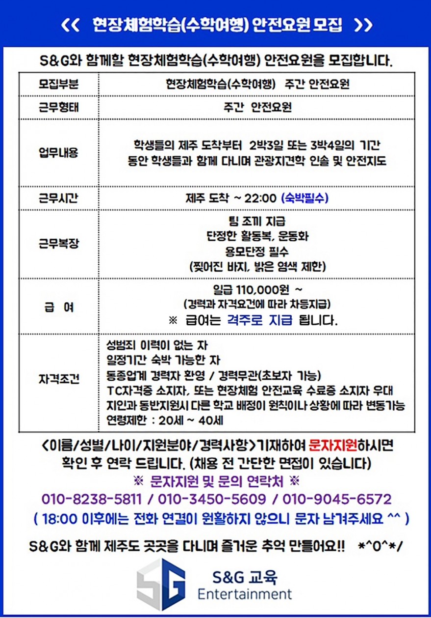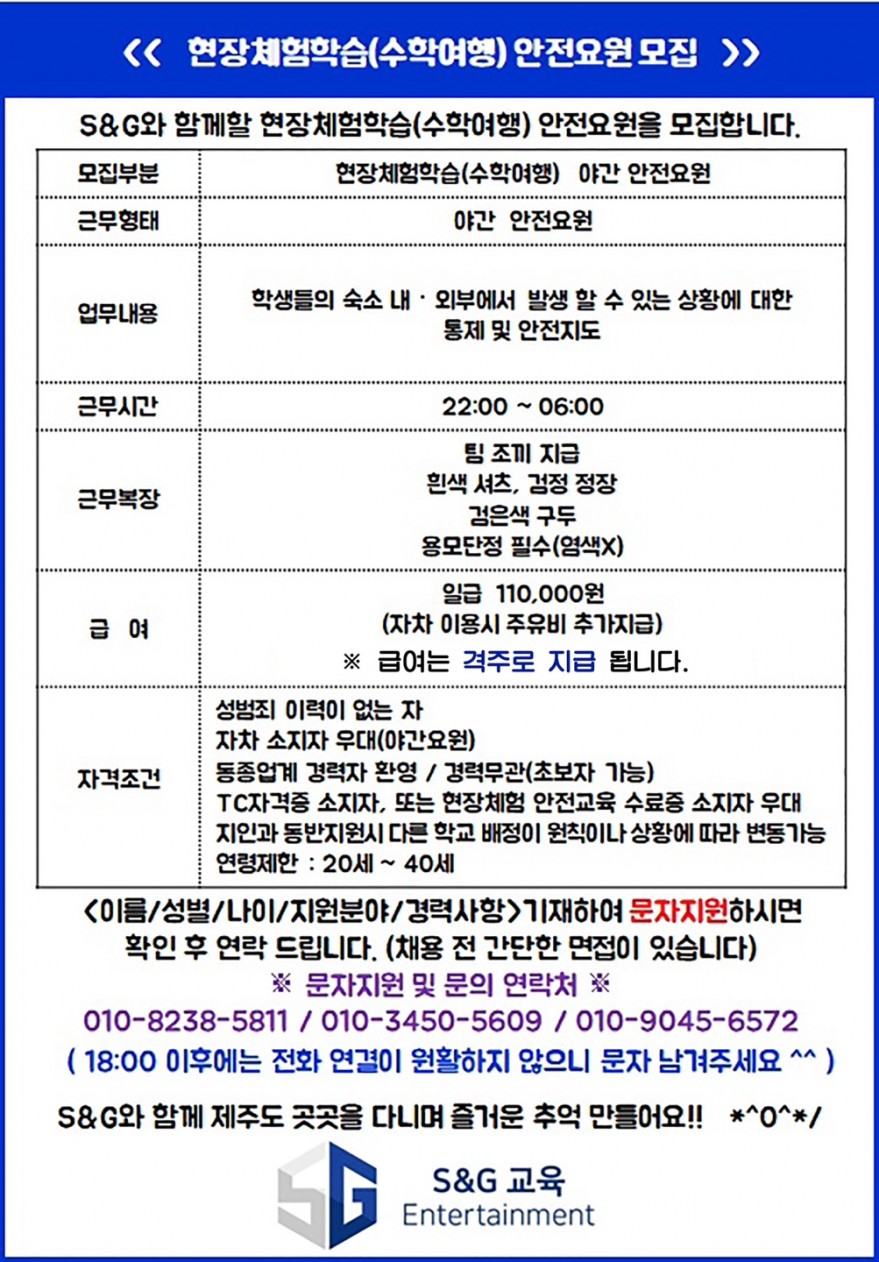 수학여행 안전요원(주간,야간) 모집합니다.