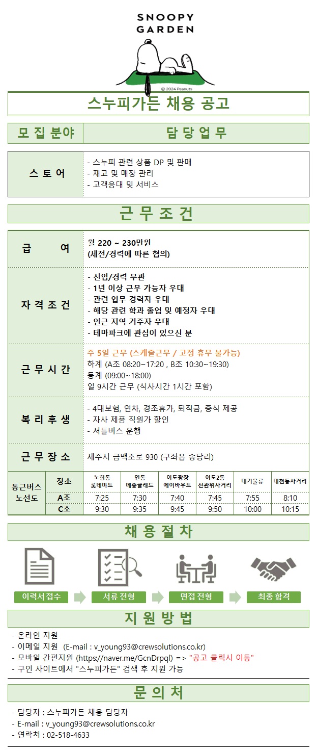 [스누피가든] 스토어(기념품판매) 및 레스토랑(주방,조리,요리) 직원 모집