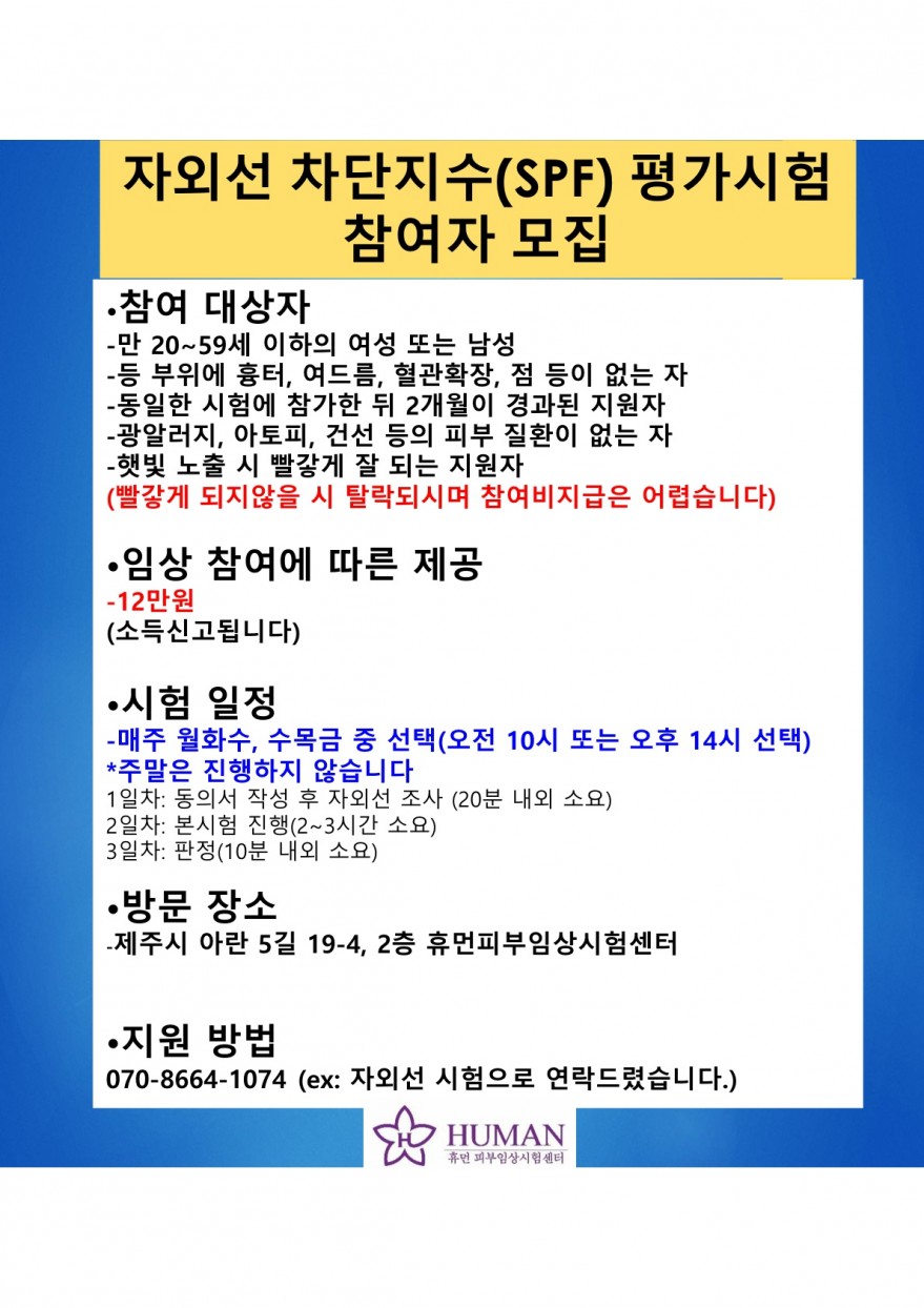 [단기,꿀알바] 자외선 차단시험 참여자 모집 / 070-8664-1074