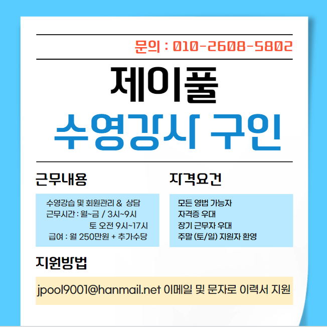 어린이 수영장 강사 정직원 채용 공고 페이지 정보 작성자 스O프 작성일24-10-02 18:19 조회3,493회 연락처 010-2608-5802 급여 월급 : 250만원 + @ 관련링크 본문 어린이 수영장 제이풀입니다.아이들과 즐겁게 수영강습 해주실 선생님을 구인합니다아이들에게 수영강습을 하고 싶은 젊은 청년들도 지원 가능합니다.영법 및 강습 교육을 통해 교육기간 이수 후 정직원 채용이 가능합니다 주소 : 제주특별자치도 제주시 연화남길 22 제이풀2호점 이전글 다음글 목록