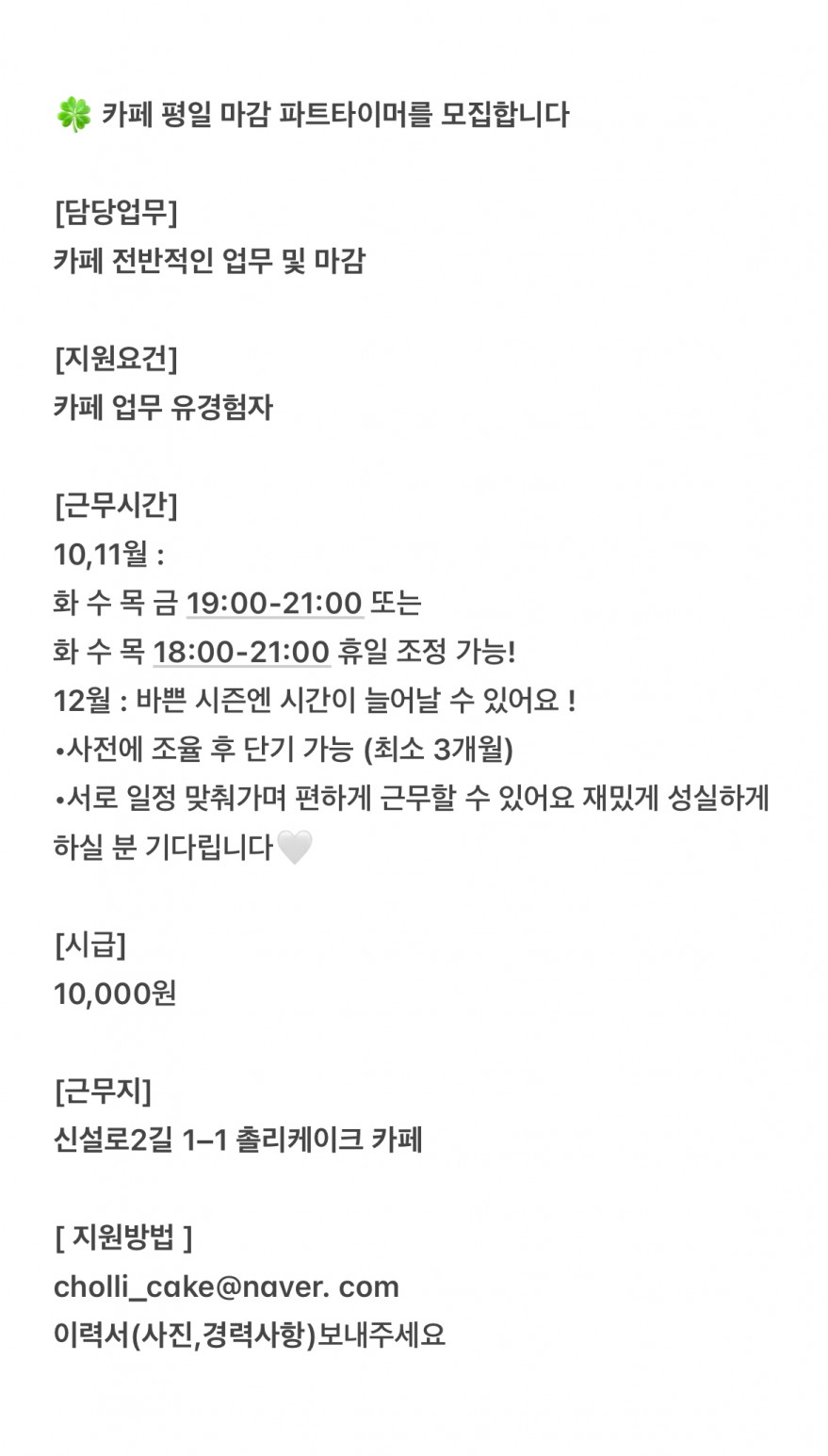 카페 평일 마감 파트 구인 ♥ 페이지 정보 작성자 cOOOOe 작성일24-10-01 00:16 조회3,583회 연락처 010-0000-0000 급여 시급 : 10,000 관련링크 본문 주소 : 제주특별자치도 제주시 신설로2길 1-1 다온드리 이전글 다음글 목록