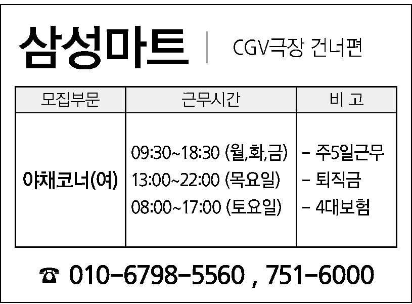 마트 직원 구합니다 페이지 정보 작성자 마트 작성일24-09-26 22:17 조회3,360회 연락처 010-6798-5560 급여 협의 : . 관련링크 본문 ((마트직원 구합니다)) 주소 : 제주특별자치도 제주시 서광로29길 4 이전글 다음글 목록