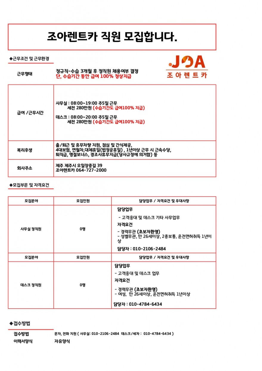조아렌트카에서 직원을 모집합니다/출퇴근,휴무차량지원/ 페이지 정보 작성자 jOOOOa 작성일24-09-26 08:52 조회3,308회 연락처 010-4784-6434 급여 월급 : 280만원 관련링크 본문 . 주소 : 제주특별자치도 제주시 오일장중길 39 조아렌트카 이전글 다음글 목록
