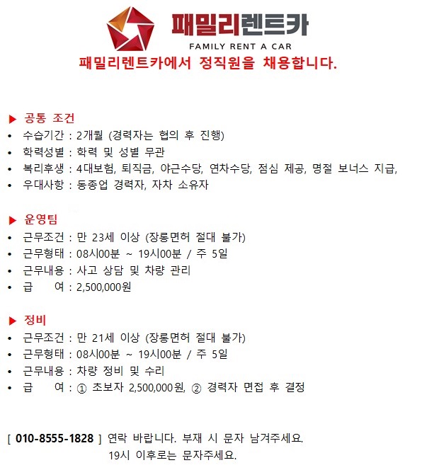 제주 패밀리렌트카 운영, 정비파트 정직원 구합니다. 페이지 정보 작성자 패OOOO카 작성일24-08-13 13:09 조회3,166회 연락처 010-8555-1828 급여 월급 : 250만 관련링크 본문 연락주세요 :) 주소 : 제주특별자치도 제주시 제성1길 67 이전글 다음글 목록