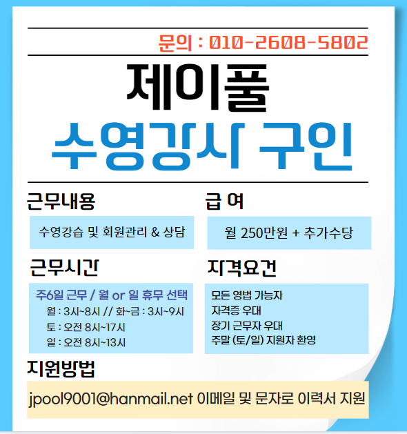 어린이 수영장 <제이풀> 수영강사 정직원 채용공고 페이지 정보 작성자 스O프 작성일24-08-09 10:12 조회2,988회 연락처 010-2608-5802 급여 월급 : 250만원+@ 관련링크 본문 어린이 수영장 제이풀입니다.아이들과 즐겁게 수영강습 해주실 선생님을 구인합니다아이들에게 수영강습을 하고 싶은 젊은 청년들도 지원 가능합니다.영법 및 강습 교육을 통해 교육기간 이수 후 정직원 채용이 가능합니다. 주소 : 제주특별자치도 제주시 연화남길 22 이전글 다음글 목록