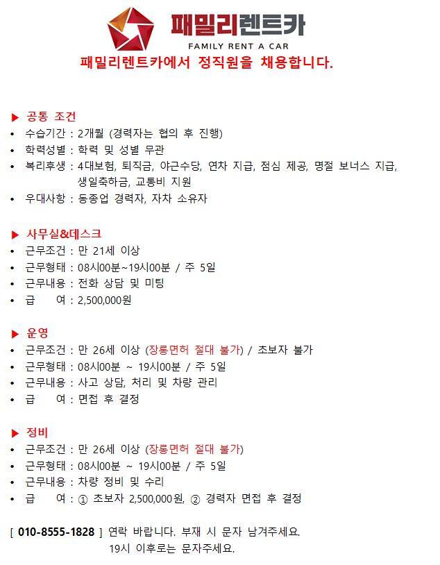 패밀리렌트카 직원 구인(사무실/정비/사고운영) 페이지 정보 작성자 패OOOO카 작성일24-09-19 16:19 조회3,687회 연락처 010-8555-1828 급여 월급 : 250만 관련링크 본문 연락주세요 주소 : 제주특별자치도 제주시 제성1길 67 이전글 다음글 목록