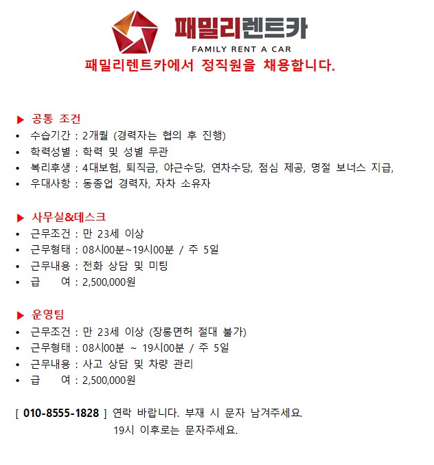 패밀리렌트카 사무실 및 운영팀 직원 구인 페이지 정보 작성자 패OOOO카 작성일24-08-01 17:35 조회3,496회 연락처 010-8555-1828 급여 월급 : 250만 관련링크 본문 연락주세요 주소 : 제주특별자치도 제주시 제성1길 67 패밀리렌트카 이전글 다음글 목록