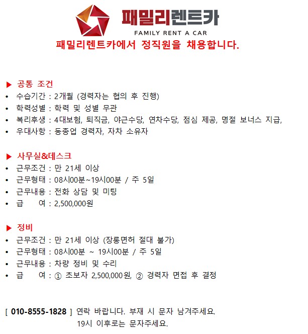 패밀리렌트카 사무실 직원 구인 페이지 정보 작성자 패OOOO카 작성일24-07-31 13:59 조회3,421회 연락처 010-8555-1828 급여 월급 : 250만 관련링크 본문 연락주세요 주소 : 제주특별자치도 제주시 제성1길 67 패밀리렌트카 이전글 다음글 목록