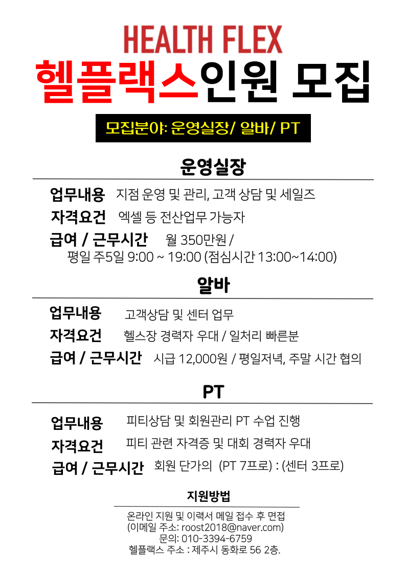 헬플랙스 헬스장 FC,CS,PT 구인