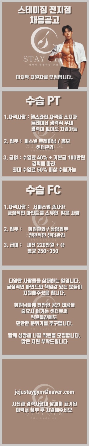 스테이짐 동문점에서 즐겁게 일하실 직원 모셔요 페이지 정보 작성자 스OO짐 작성일24-07-12 21:32 조회3,182회 연락처 010-8361-5241 급여 협의 : 0 관련링크 본문 밝고 긍정적인 직원 기다리고 있습니다 많관부!!! 이력서 첨부 후 연락 주세요!! 주소 : 제주특별자치도 제주시 동문로 80 3층 스테이짐 이전글 다음글 목록