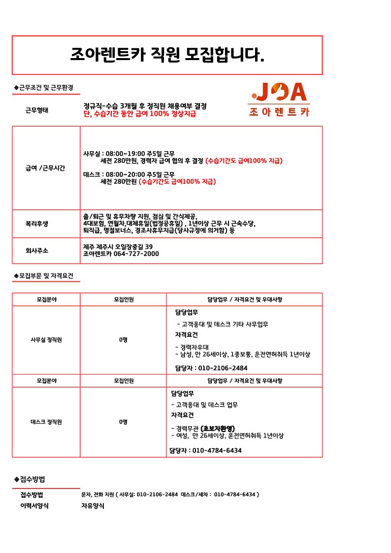 조아렌트카에서 직원을모집합니다/출퇴근,휴무차량지원/ 페이지 정보 작성자 jOOOOa 작성일24-06-26 09:30 조회3,849회 연락처 010-4784-6434 급여 월급 : 280만원 관련링크 본문 . 주소 : 제주특별자치도 제주시 오일장중길 39 조아렌트카 이전글 다음글 목록
