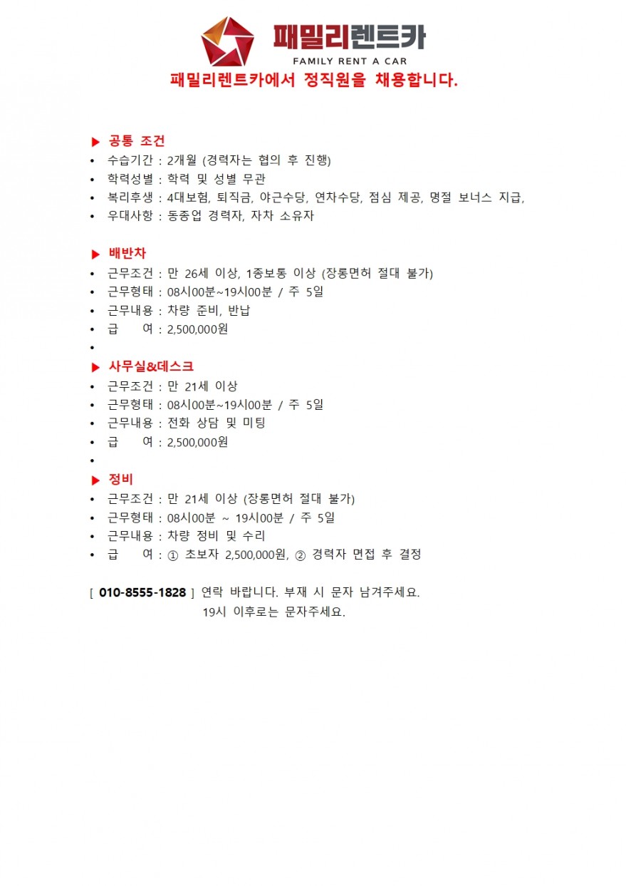 패밀리 렌트카에서 함께 일할 직원 모집합니다. 페이지 정보 작성자 제OOOOOO카 작성일24-06-21 15:17 조회3,392회 연락처 010-8555-1828 급여 월급 : 250만원 관련링크 본문 연락부탁드립니다. 주소 : 제주특별자치도 제주시 제성1길 67 패밀리 렌트카 이전글 다음글 목록