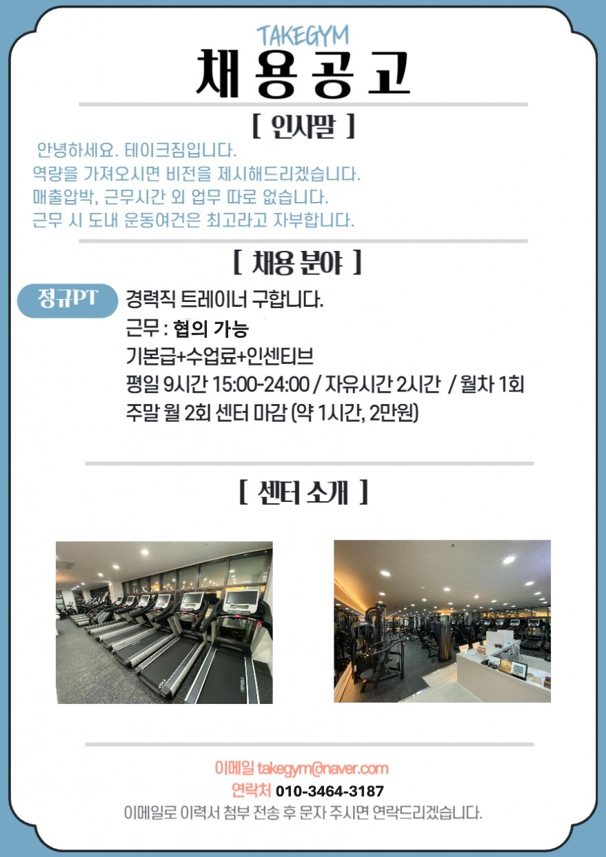 노형 헬스장 테이크짐에서 트레이너(정직원/프리/대관) 구인합니다^^