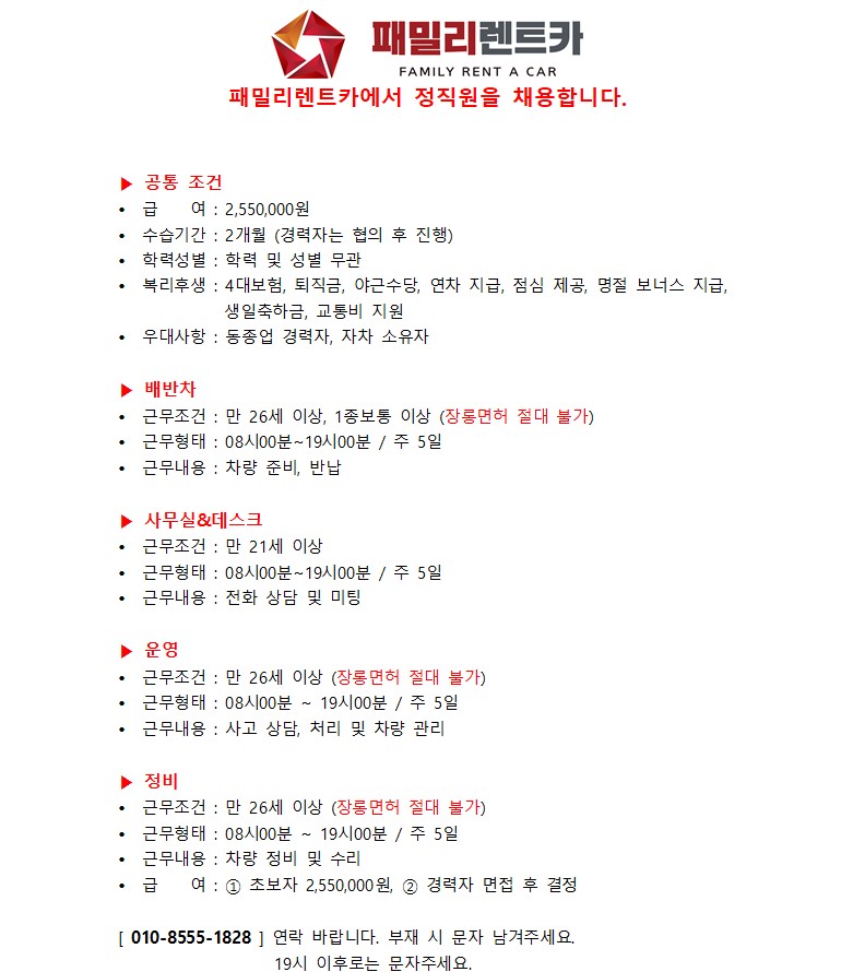패밀리렌트카 정비파트, 운영파트 정직원 구인 페이지 정보 작성자 패OOOO카 작성일25-07-03 18:43 조회1,110회 연락처 010-8555-1828 급여 월급 : 255만 관련링크 본문 연락주세요 주소 : 제주특별자치도 제주시 제성1길 67 이전글 다음글 목록